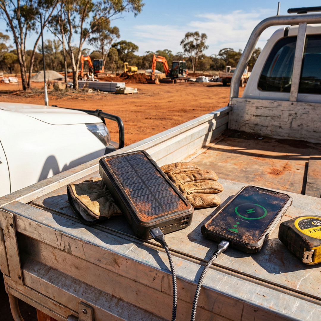 Solar panels keep it topped up during the day. Attach it to your ute, pack, or toolbox and it charges while you work. When the power goes out or you're off-grid, you've got backup that actually works.